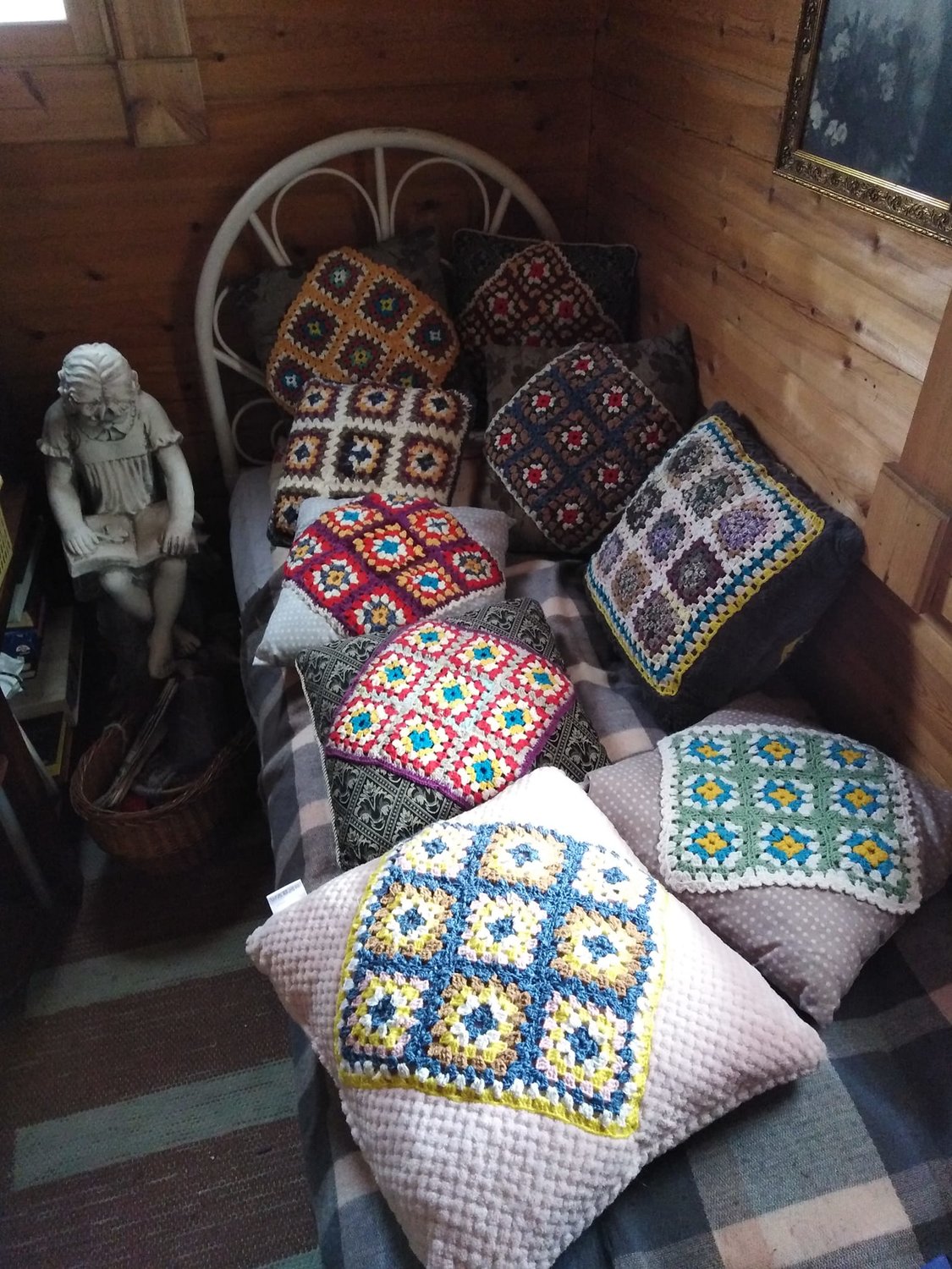 Viereisessä kuvassa on 85-vuotiaan Hilkka Prittisen virkkamista ”isoäidin neliöistä” ommeltuja tyynyjä. Isoäidin neliöitä voi virkata muista töistä jääneistä pienistäkin lankanyssäköistä. Onnistuneen lopputuloksen aikaansaaminen on aina voimaannuttava, itsetuntoa tukeva kokemus, mutta käsityönäyttelyn voi järjestää myös keskeneräisistä töistä. Käsityöharrastus lisää hyvinvointia. Harrastuksen voi aloittaa missä iässä tahansa. Viereisen kuvan 9-kymppinen herra Ahvenjärvi aloitti kudontaharrastuksensa noin 20 vuotta sitten.