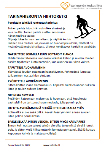 Parin kummallakin osapuolella on oma tarina, mutta liikkeet ovat samat. Tarinarentoutuksen tekeminen ryhmässä tuo hyvää oloa niin tekijälle kuin nauttijalle. Näillä rentoutuksilla tuotetaan lempeää kosketusta ja luodaan samalla rentouttajalle tärkeä kokemus miellyttävän hetken tarjoamisesta toiselle henkilölle. Se vahvistaa merkityksellisyyden tunnetta. Jos rentoutusliikkeiden tekijä ei jaksa seistä, tuolit voidaan asettaa peräkkäin. Liikkeet ovat helppoja. Ohjaaja lukee tarinaa ja samalla näyttää omilla käsillään, miten liikkeet tehdään. Tarinan loputtua kiitetään rentoutuksen tekijää, vaihdetaan roolit toisin päin ja luetaan toinen tarina. Jos osallistujia on pariton määrä ja lukija toimii myös rentouttajana, hän näyttää jokaisen liikkeen välissä ilmaan seuraavan liikkeen. Jotta tarinan lukeminen ja liikkeiden tekeminen onnistuisi yhtä aikaa, tarinapaperin voi laittaa nuottitelineeseen tai teipata seinään. Tarinarentoutuksen voi tehdä myös hoitaja, ohjaaja tai läheinen, jolloin voi valita tarinapareista jomman kumman.