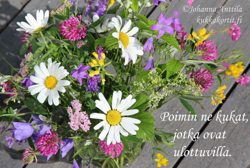 - Johanna Anttilan kuvaamia vanhuksille tuttuja perennoja ja luonnonkukkia varustettuna Senioritoiminnan voimauttavin lausein.