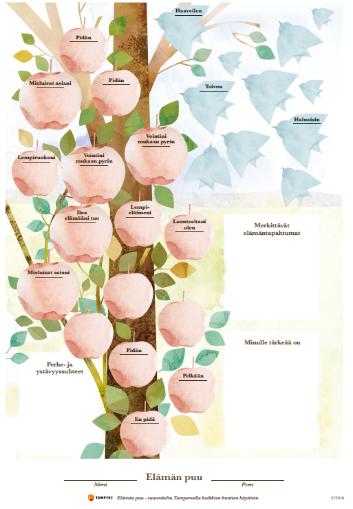 Tampereella suunniteltu seinälle ripustettava Elämän puu on tulostettava juliste (kuva), johon kirjataan henkilön haaveet ja toiveet, tärkeät asiat elämän varrelta, mieltymykset sekä seikat, joista ei pidä. Julisteessa ne ovat niin tiiviisti, että ne on siitä nopea ja helppo tarkistaa. Elämänpuuhun ei kuitenkaan mahdu riittävästi tarpeellista tietoa, joten se tarvitsee rinnalleen kansion tai vihon, josta löytyy kattavammin tarpeellista tietoa esim. muistisairaan henkilön ymmärtämiseen ja sopivan viriketoiminnan suunnitteluun. Turun kotihoidon ohjeita Elämän puun käyttöön.