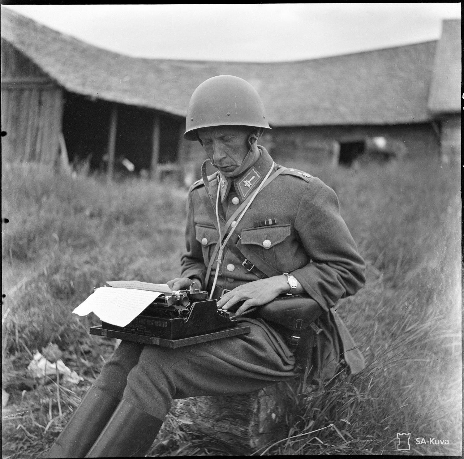 Tietoja Suomen sotahistoriasta voi etsiä myös Sotapolku.fi-verkkopalvelusta. Sinne voi myös lisätä sukulaisen tietoja ja vaiheita sotien aikaan. Kantakortista ilmenee, missä joukko-osastossa sotilas on kulloinkin ollut. Sen avulla voi päästä lukemaan joukko-osaston päiväkirjoja. Niitäkin löytyy verkosta. Viereinen kuva: Rintamareportteri työskentelee äsken vallatun talon pihalla. A. Haapakoski, sotakirjeenvaihtaja, valokuvaaja, Sotamuseo, CC BY 4.0.
