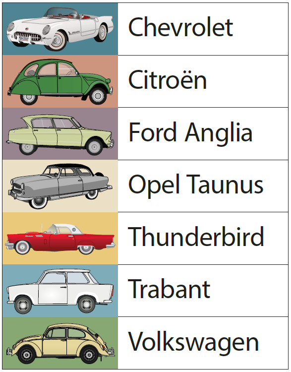 Autodomino-korteissaon seitsemän vanhan, tutun auton kuvat ja nimet. Tulosta,mattalaminoi ja leikkaa sellaisiksi kokonaisuuksiksi, millaisia haluat käyttää; esimerkiksi vain viereisessä kuvassa näkyvät autot ja niiden nimet, jotka voi leikata kaikki irralleen ja yrittää yhdistää oikeat parit keskenään. Ohjeiden mukaan leikaten syntyy dominopalaset.(isot kuvat)