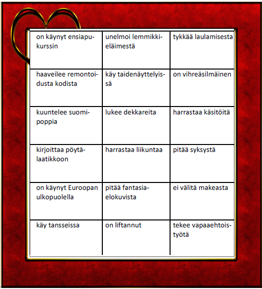 Pikkujouluihin ym. tapahtumiin, joihin osallistuu yli 20 henkilöä, sopii Bingon kaltainen Etsi kaveri -tehtävä. Tulosta jokaiselle osallistujalle paperi ja jaa kynät. Kun tehtävä on suoritettu eli lappu täynnä nimiä, voidaan ohjeistaa siirtymään kahville sellaisen henkilön kanssa, jolla on sama harrastus/ominaisuus/ toive kuin itsellä, mutta jota ei tuntenut etukäteen. Etsi kaveri -tehtävä 2,Etsi kaveri -tehtävä 3