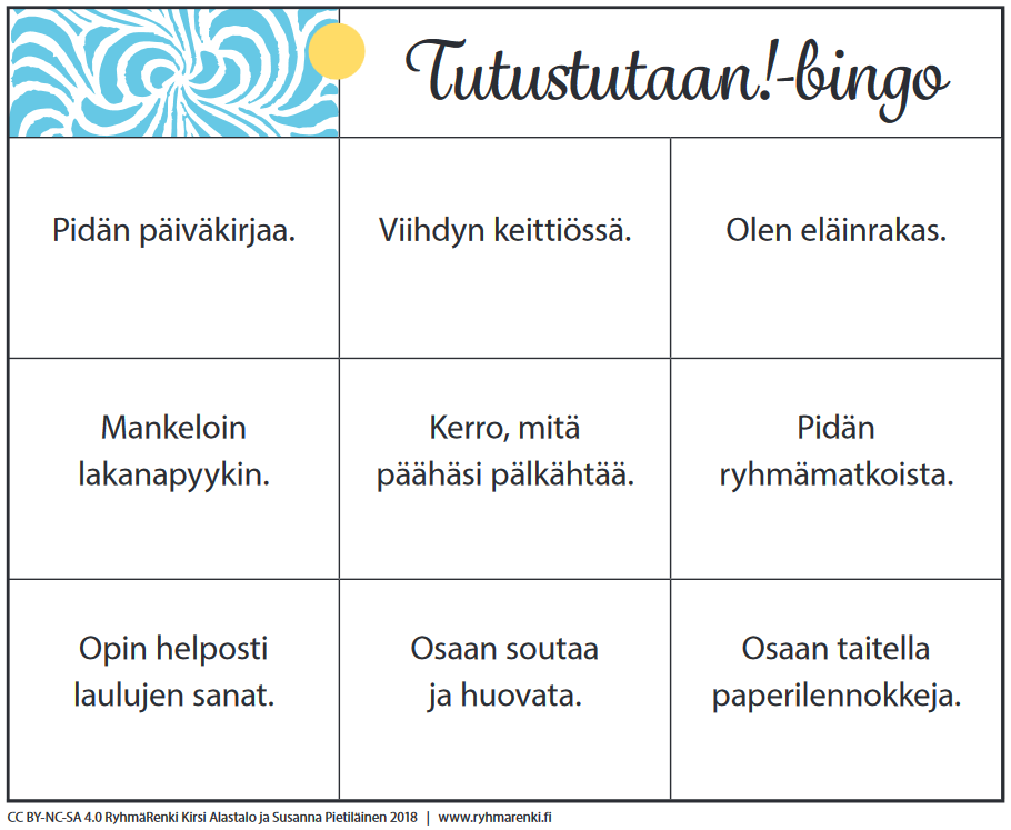 Ohjaaja voi ohjeistaa ryhmän kertomaan itsestään näin: