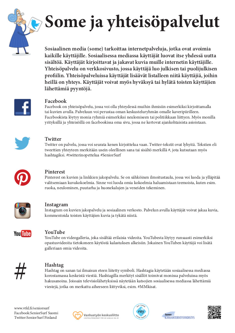 Sosiaalinen media eli some tarkoittaa tietoverkkojen kautta ja tietotekniikan avulla tapahtuvaa yhteydenpitoa ihmisten välillä. Somessa luodaan, jaetaan ja vaihdetaan tietoa, ajatuksia ja kuvia. Blogien ja yhteisöpalveluiden kautta voi tutustua moniin aihealueisiin, etsiä ja kysyä lisätietoa jostain tai kertoa itse kokemuksistaan. Niihin voi osallistua tarkastelijana tai aktiivisena osallistujana. Kaikenlaiset ihmiset kirjoittavat blogeja, joten asiallisen tiedon joukossa voi olla myös aivan puuta heinää. Tulosta viereinen esite.